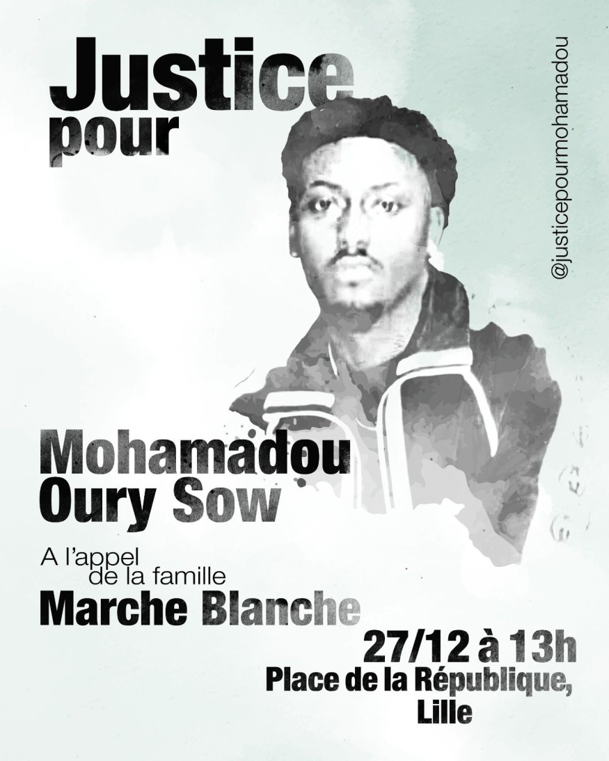 La famille de Mohamadou Oury SOW entourée de proches, de soutiens associatifs et de citoyens, organise une marche blanche le 27/12/2025 à 13h au départ de la Place de la République à Lille jusqu’au Tribunal Judiciaire de Lille.