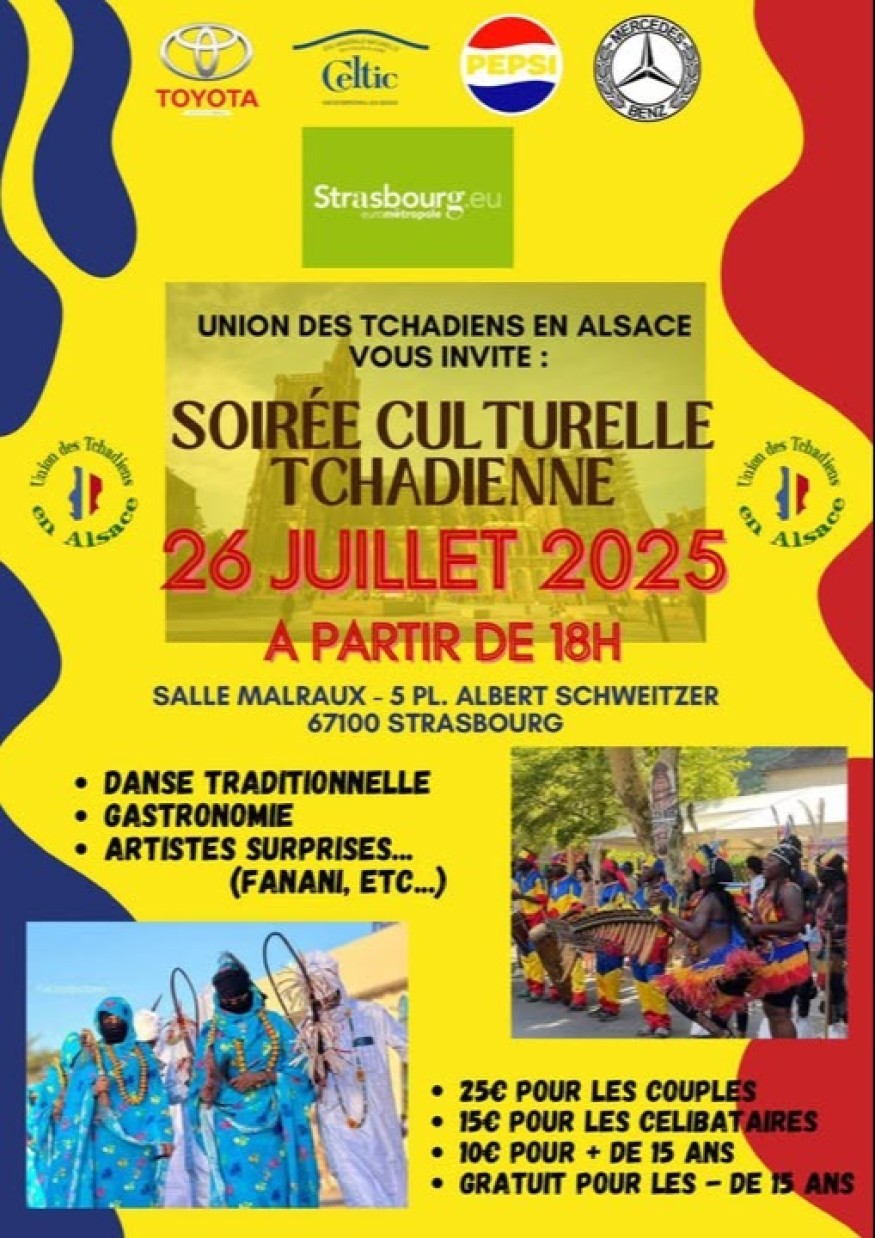 Au programme de cette soirée exceptionnelle : des danses traditionnelles, une dégustation de la gastronomie tchadienne, ainsi que des surprises mettant en avant les talents artistiques du Tchad. Un moment de partage, de convivialité et de découverte pour tous les amoureux de la culture tchadienne et alsacienne.