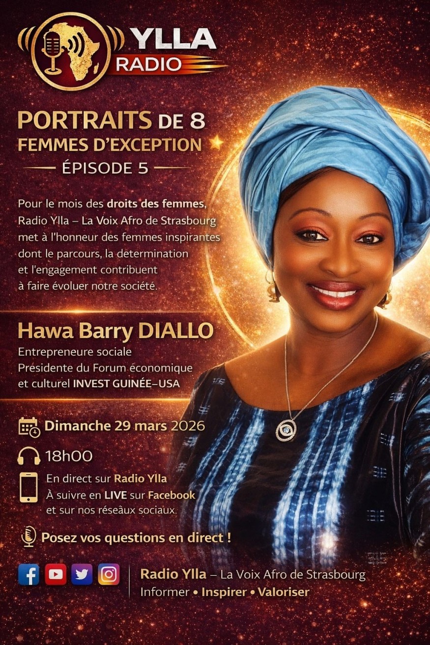 Dans le cadre de sa série spéciale consacrée au mois des droits des femmes, Radio Ylla – La Voix Afro de Strasbourg poursuit sa mission de valorisation des parcours féminins d’exception. Pour ce cinquième épisode, la rédaction met à l’honneur une figure majeure du leadership féminin diasporique : Hawa Barry Diallo, entrepreneure sociale et présidente du Forum économique et culturel Invest Guinée–USA.